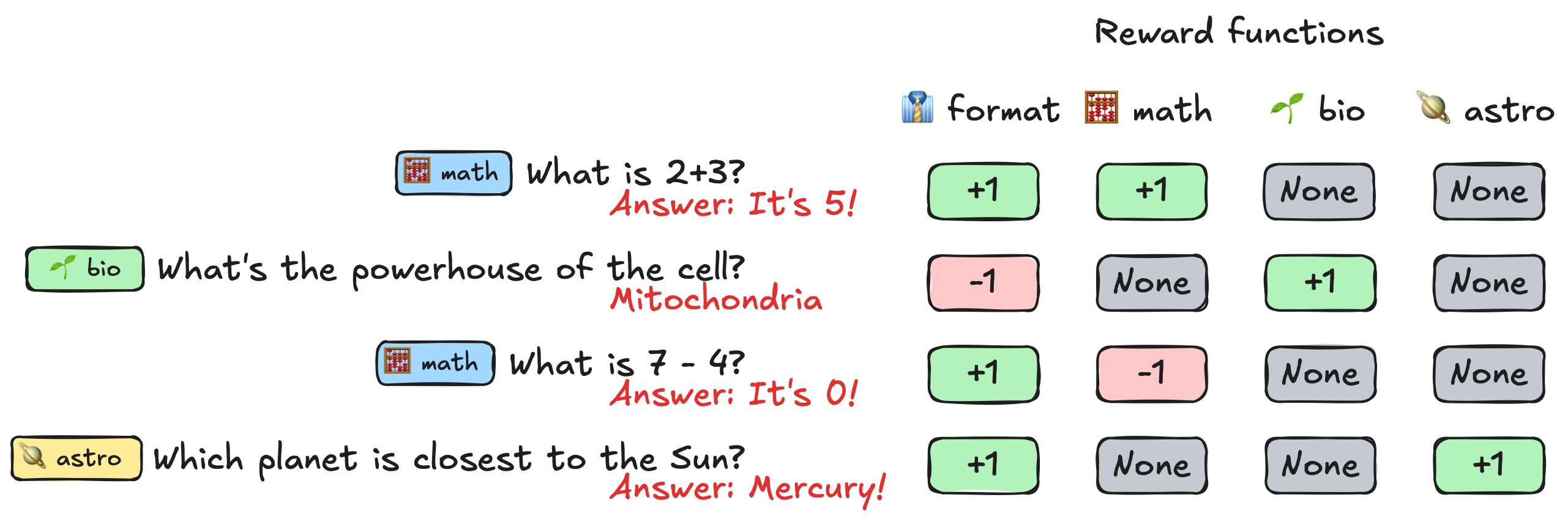"Once again, the above rewards are determinisitc, it means that there is not need for a reward model here. You may be familiar with the RLHF (Reinforcement Learning from Human Feedback) approach, where a reward model is trained to predict the reward for a given input. **This is not the case here.** That's why we call this approach **Verifiable Rewards**.\n",